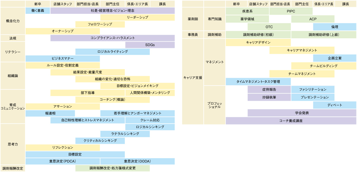 ポトス薬局では、薬剤師・事務員としての専門的なスキルに加え、人間力を向上させるための階層別研修を用意しています。さらに、受講形態としてeラーニングを取り入れることによって、自分の好きな時間に繰り返し学びを深めることが可能です。