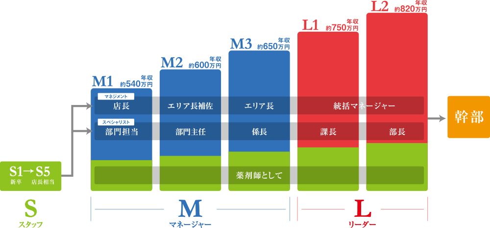 3ヵ月間、店舗配属をせずに基礎をしっかり学びながら同期との繋がりを深められます。研修内容は、経験豊富な専属の研修スタッフによるOJT研修と、「社会に出てから必要なビジネススキル」「病院で学ぶような臨床薬学スキル」をしっかり身につけられる週1回の集合研修プログラムとなっており、社会人としての基本・薬剤師に必要なスキルを習得できます。